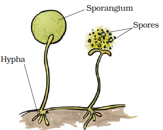 Answer: Fungi on a bread piece grow from spores which are present in the air. When spores are released they keep floating in the air. As they are very light they can cover long distances. Spores are asexual reproductive bodies. Each spore is covered by a hard protective coat to withstand unfavourable conditions such as high temperature and low humidity. So they can survive for a long time. Under favourable conditions, a spore germinates and develops into a new individual.