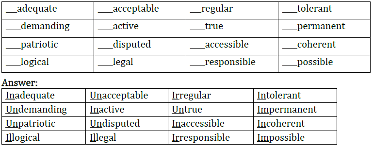 Now form the opposites of the words below by prefixing un– or in-. The prefix in- can also have the forms il-, ir-, or im– (for example: illiterate –il + literate, impractical –im + practical, irrational – ir + rational). You may consult a dictionary if you wish.