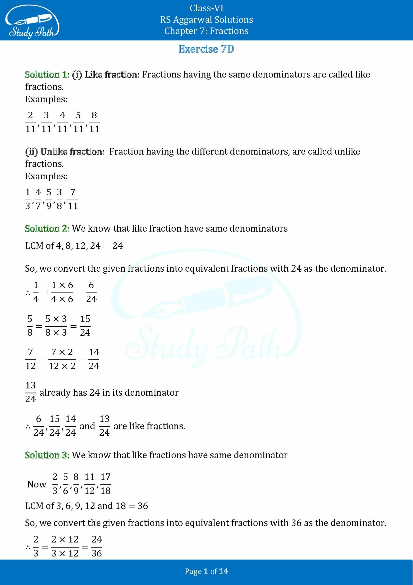 RS Aggarwal Class 6 Maths Solutions for Chapter 7 Fractions Exercise 7D are provided here. These solutions have been prepared by expert teachers as per the questions given in the latest edition of the RS Aggarwal book. The answers to the questions are explained in detail to help students with their exam preparation. We at Study Path emphesized on the fundamentals and explained each question in the simplest way possible. Our RS Aggarwal Solutions for Class 6 help students complete their homework and revise the entire syllabus.