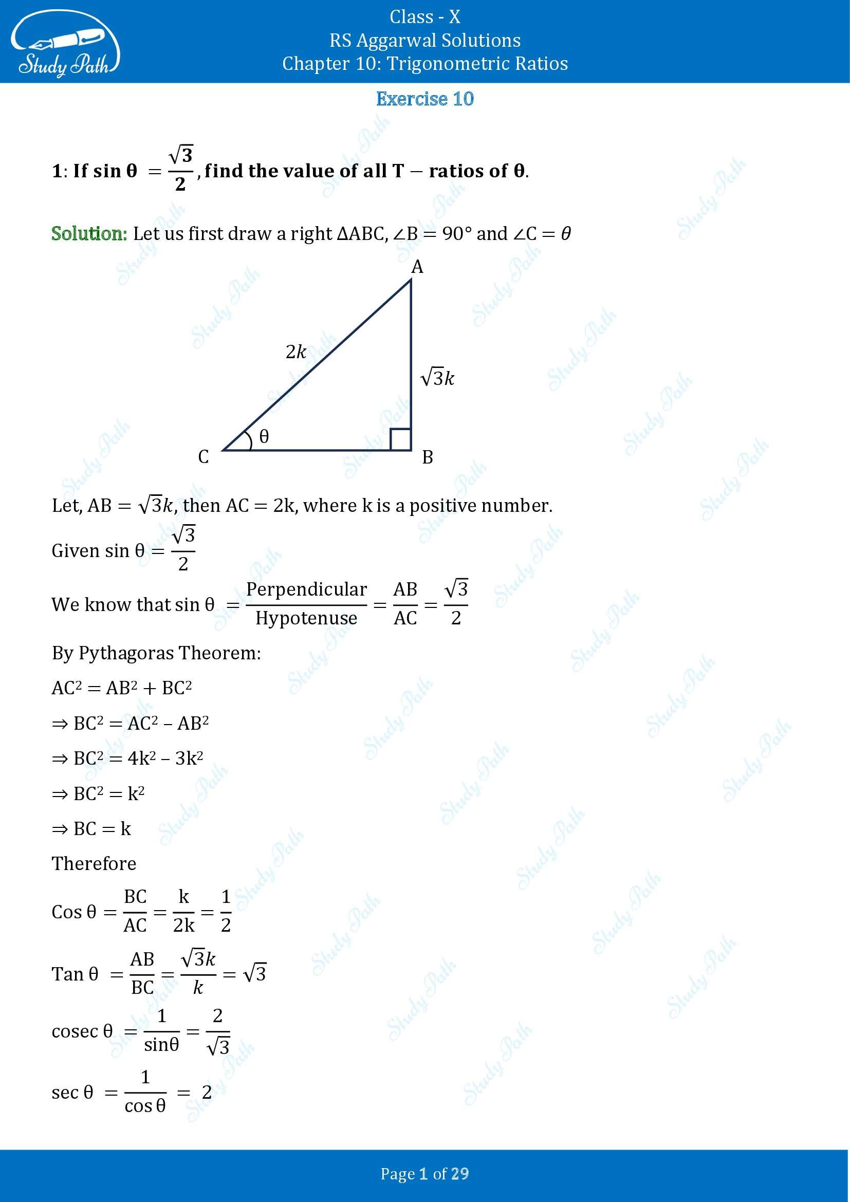 RS Aggarwal Solutions for Class 10 Chapter 10 Trigonometric Ratios Exercise 10 00001