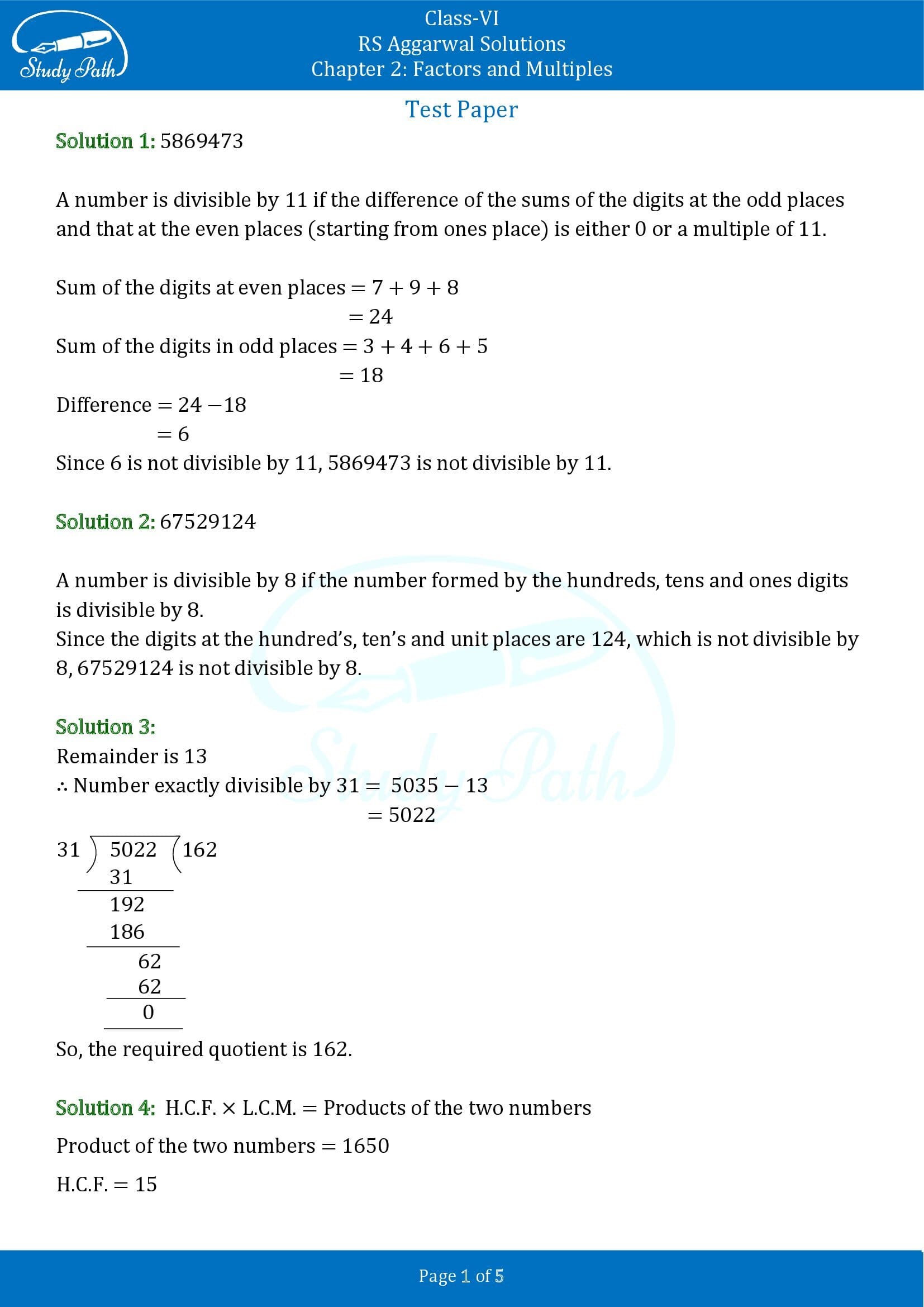 Class 6 RS Aggarwal Chapter 2 Factors and Multiples Solutions Test Paper